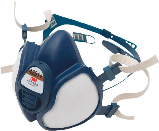 3M kombinált szűrőfélálarc 4000+ sorozat FFA1P2RD, részecskék és szerves gázok ellen 1000 ppm-ig (festékszórás), 4251+ alacsony profil a jobb látásért puha, nem allergén szövet anyag felületi tömítéssel állítható fejpánt és könnyen rögzíthető nyakpánt