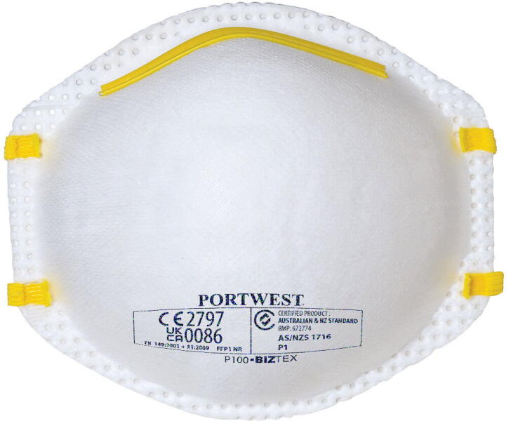 Alapanyag : Polipropilén, PU hab  Termékválaszték : FFP1 egyszerhasználatos maszkokEgyszerhasználatos maszk FFP1 szint, véd a nem mérgező porok és / vagy vízbázisú aeroszolok ellen. A szűrés minimális százaléka 80%. A TLV (FFP1 maszk névleges védelmi tényező) legfeljebb négyszerese ellen nyújt védelmet. Felhasználási példák: kő / törmelék / cellulóz kezelése.   Jellemzők Kényelmes csésze kialakítású. Állítható orrnyereggel készül. Védelmet biztosít porok, ködök és egyéb szilárd részecskék ellen.   Tulajdonságok - UKCA-jelölés folyamatban (Egyesült Királyságban forgalomba hozott termék)- CE minősítés (EU direktíváknak megfelel)  Szabványok A S/NZS 1716 P1EN 149 FFP1 NR